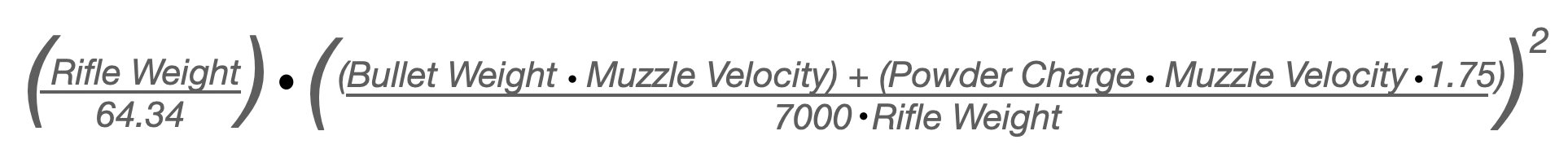 There are only four numbers that you need to know to calculate this equation; rifle weight(lbs), muzzle velocity(fps), bullet weight(gr), and powder charge(gr).