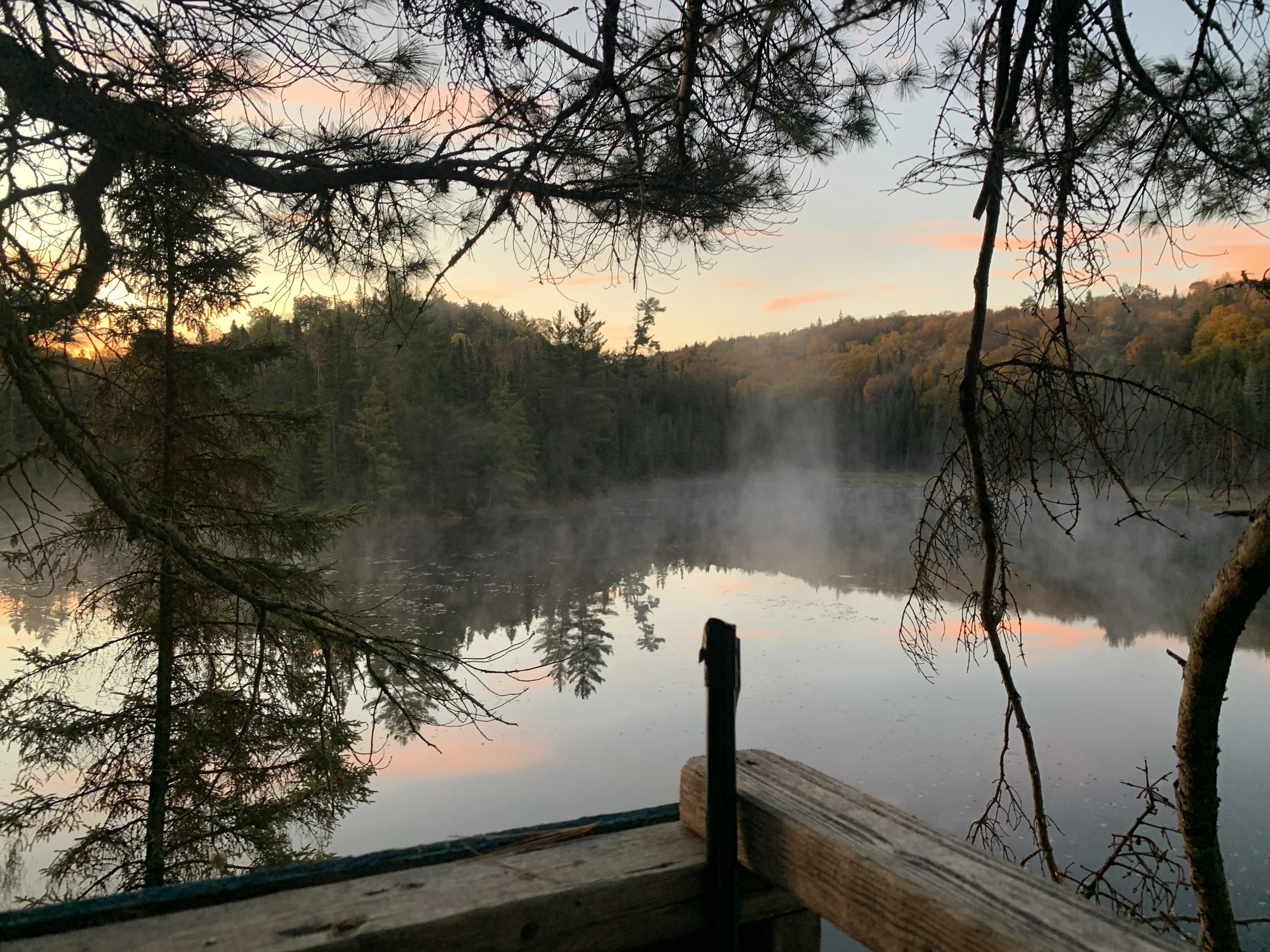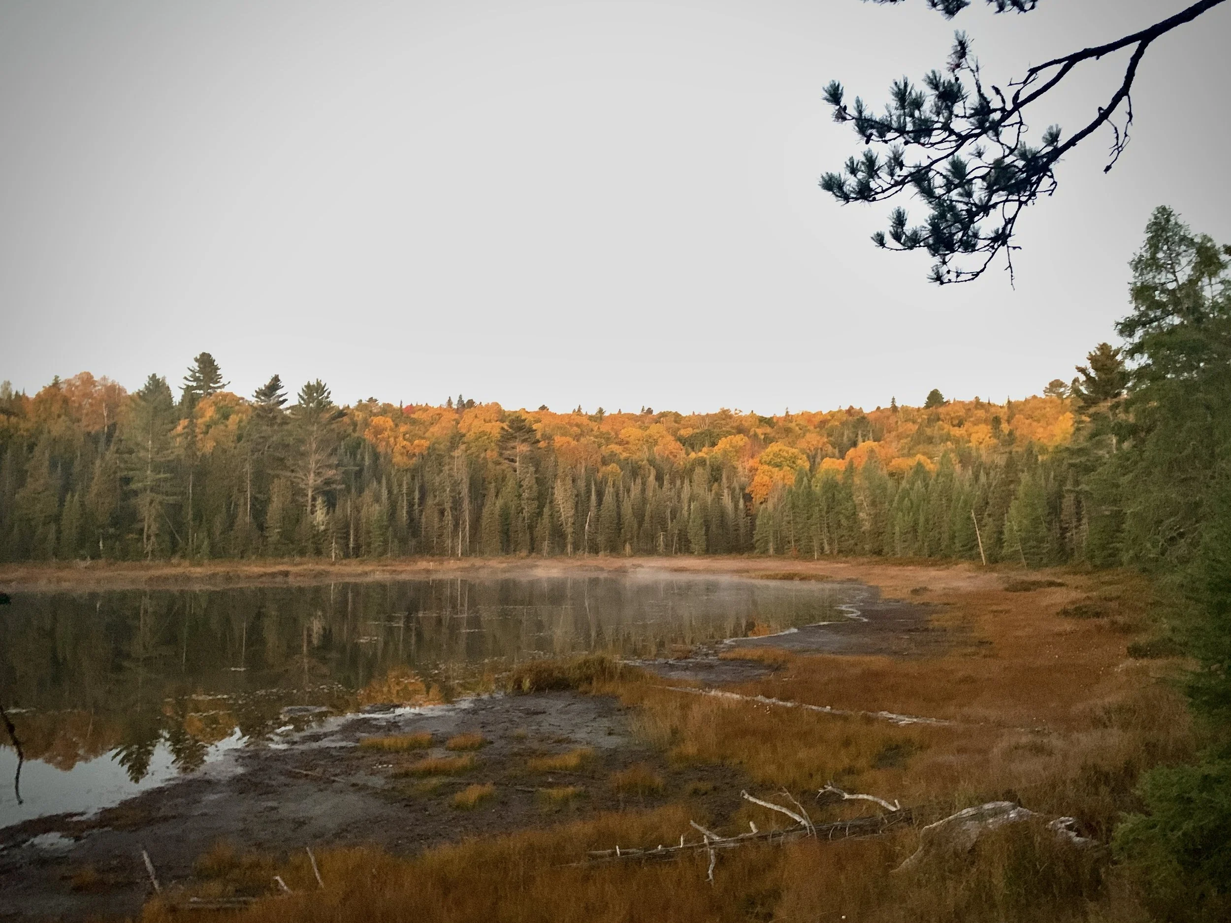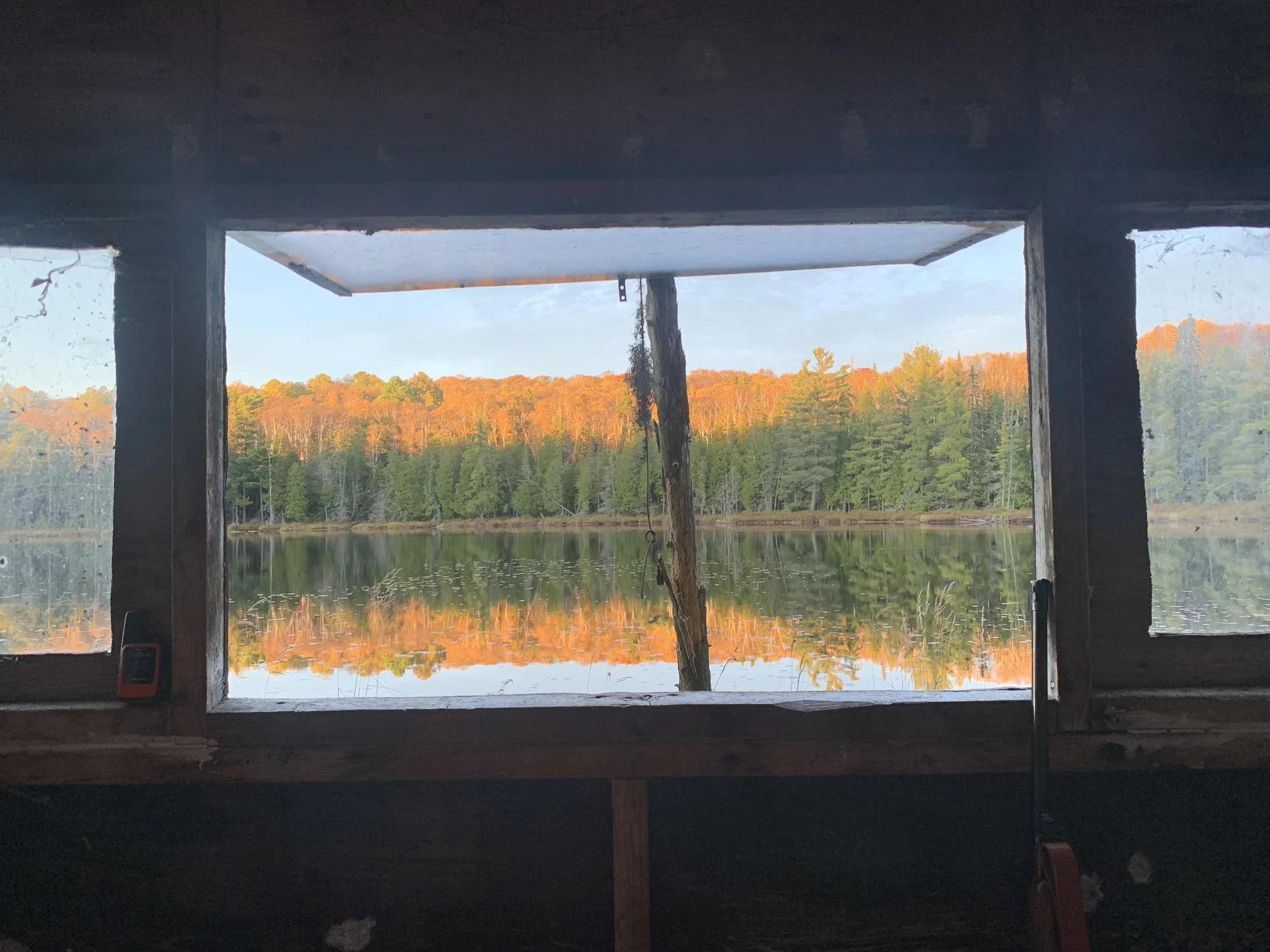 We paddled back across the lake exhausted. We soaked our feet in the cold lake and took a short nap. I headed back down to the lower lake for an evening sit. This lower lake has really become my favorite. Tons of tracks as well as a beautiful backdrop of fall colors. Forgot to mention flushing a large male ruffed grouse earlier. Scared the shit out of me just like at home.