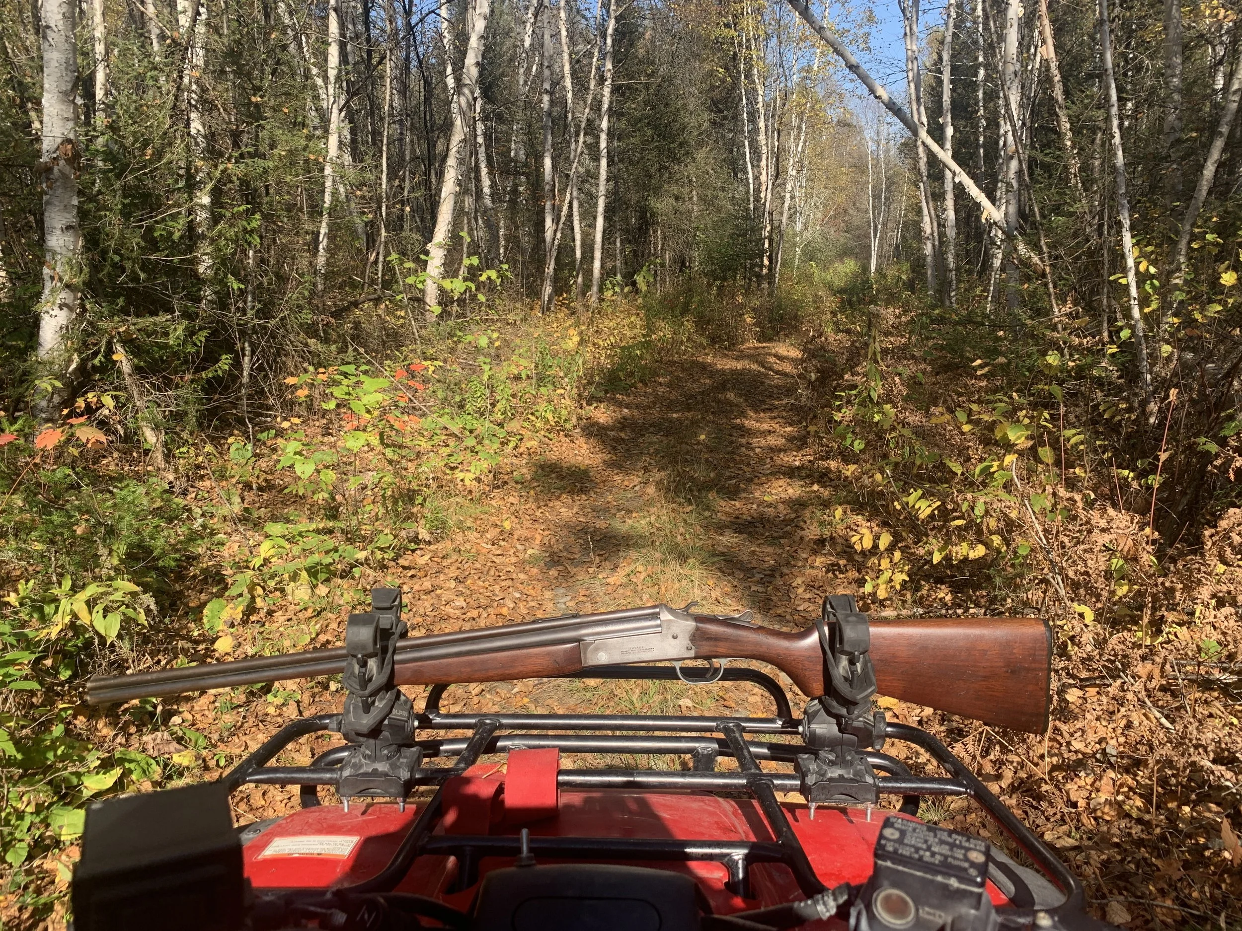 Went back to the big lake stand to make another attempt at that bull. May have heard him on the other side of the trail. It got into the 80s so we elected to spend mid-day at camp. I took the Savage Model 24 for a ride on the four wheeler. Beau had brought a grouse home for lunch and we needed one more for a complete meal. Within 10 minutes I was back at camp with a grouse.